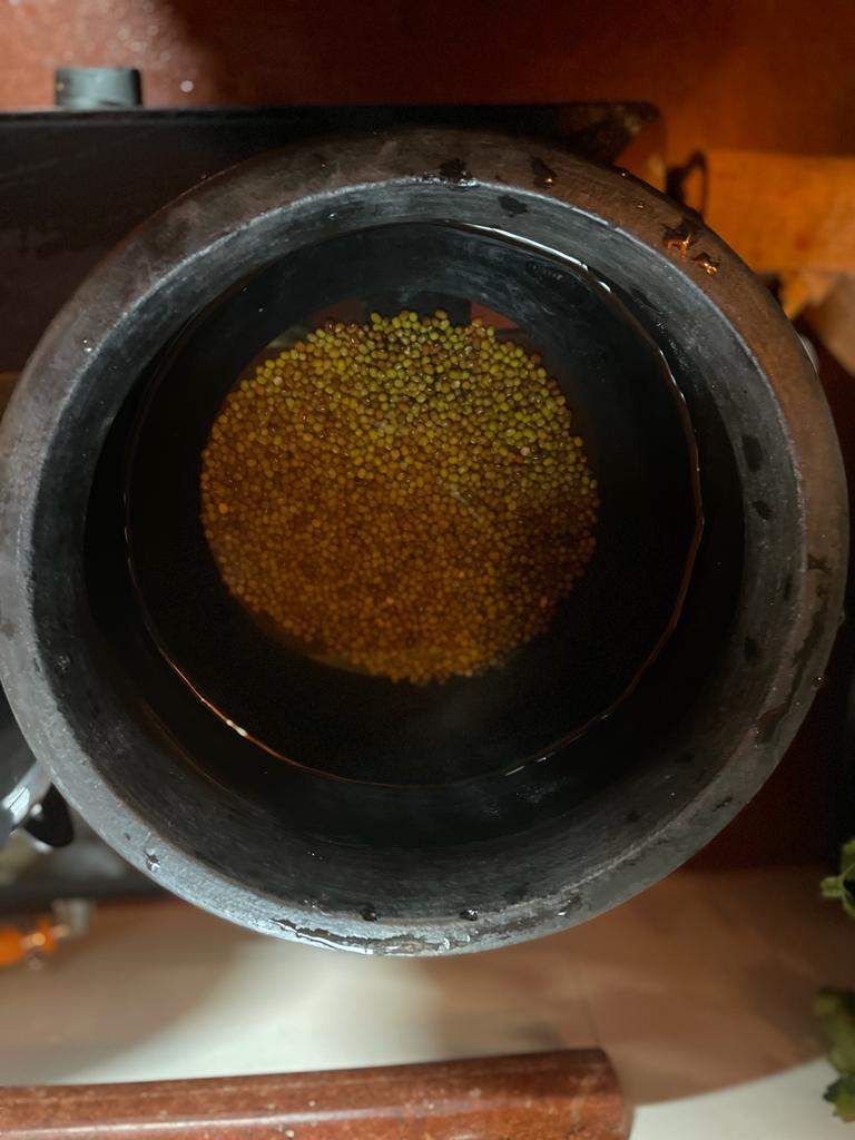 Step 1. dry roast the sesame seeds on low flame, stirring continuously to prevent overheating or burning. Use an iron vessel. When a nice aroma is emitted after 3-4 minutes of stirring, with a slight darkening of the seeds to a golden brown, remove from the kadai and place into an earthen pot. |