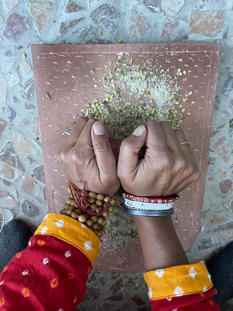 | 5 gm fresh adraka paste (ginger) | Step 3. Mix in adrak paste and stir well for 5-8 minutes on low heat, then remove the vessel from heat. |